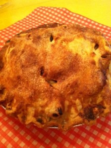 When you are ready to roll out dough, lightly flour board as well as rolling pin. Press down dough and roll in one direction. Be sure to turn over dough frequently to prevent sticking. Roll out to about a 10″ circle. Place into a 9″ pie pan. Fill with apple mixture and roll out top crust. Crimp the edges with fork tines or fingers. When pie is assembled place in refrigerator for 30 minutes. This will secure the butter firms up again and assures a flakier crust.